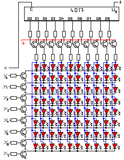 Mit einer Schaltung mussten wir erreichen, dass jede Diode bzw. jede Diodenreihe einzeln angeregt wird. Dies erreicht der integrierte Schaltkreis 4017. Liegt also an der Basis des Transistors Spannung an, wird der Transistor durchlässig, leitet den Strom und spricht somit eine Diodenreihe an. Die Impulse für den integrierten Schaltkreis werden von uns ausgegeben und erzeugen somit den Takt. Der Takt muss während des ganzen Programms laufen. Mit jedem Takt spricht der integrierte Schaltkreis die nächste Diodenreihe an und beginnt, wenn er am Ende angekommen ist, von vorn.
